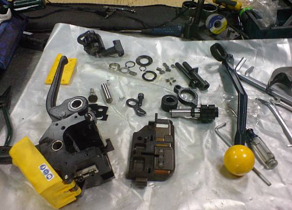 當零件全部拆解後(大部分解)開始組裝,需在20分鐘內組裝好一台手動鋼帶打包機。