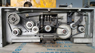 這台OMS全自動塑鋼帶打包機因為無法拉緊及黏合,我技師將其機頭載回做檢修