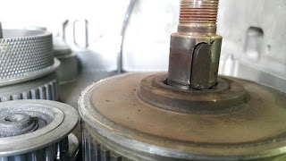 使用手去轉動這圓盤,發現無法煞車,這照片表示OMS全自動塑鋼帶打包機之零件與齒輪長期互相摩擦而導致之現像。